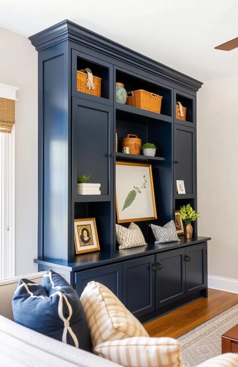 Custom built-in cabinets in navy blue can add a touch of luxury to any room. They offer tailored storage solutions while enhancing the decor.