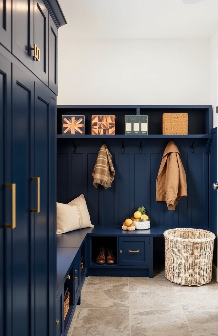 Navy blue cabinets in the mudroom can make a practical space look stylish. They provide ample storage for shoes, coats, and other outdoor gear.