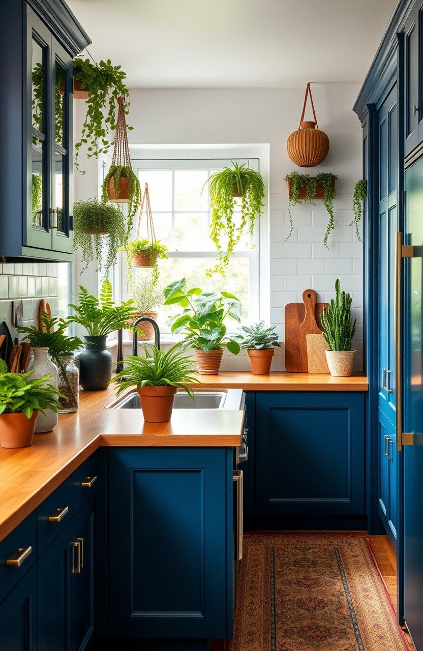 Incorporate plenty of greenery to complement your navy blue cabinets. Plants add life and a fresh bohemian touch.