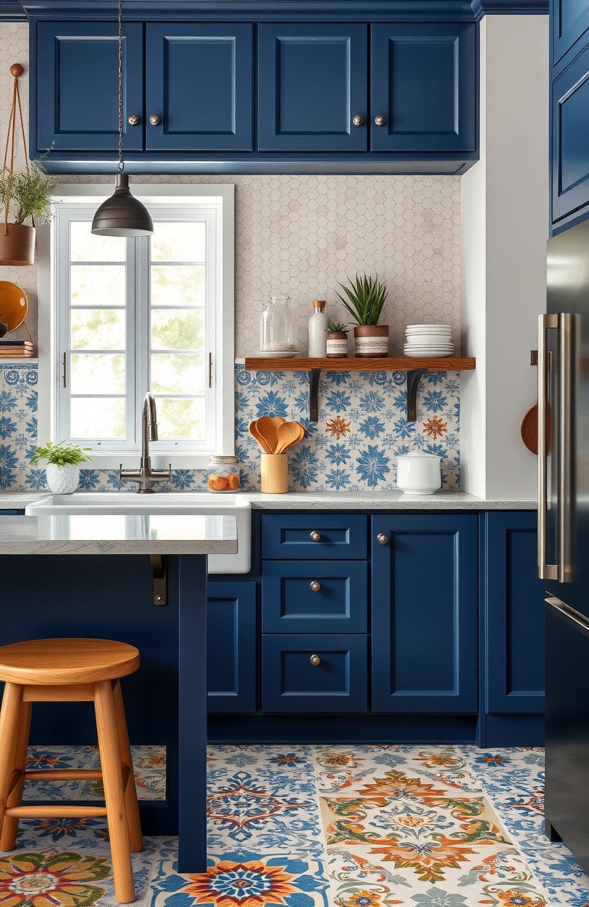 Incorporate artistic tiles on the floor or as a backsplash. They add a creative and colorful touch to your navy blue kitchen.