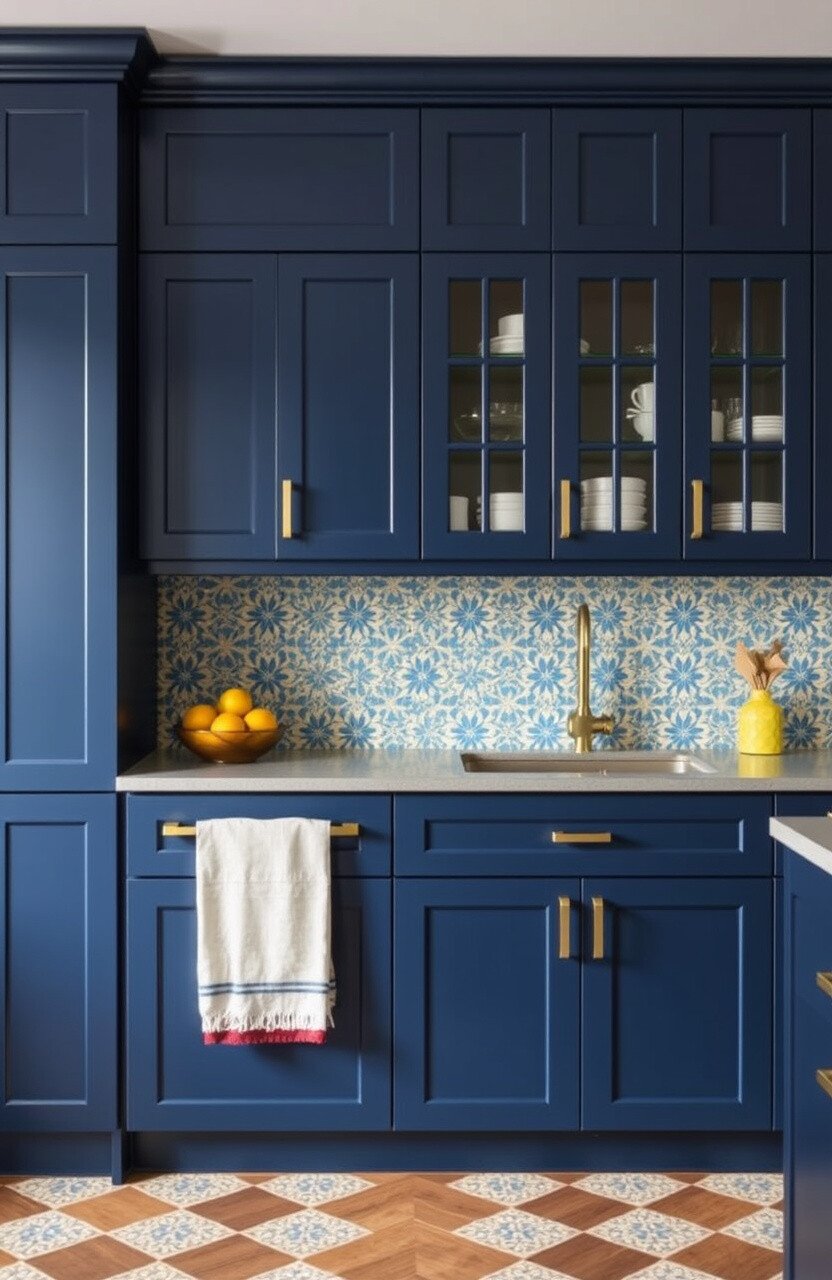 Add a patterned backsplash to your navy blue cabinets for a boho-chic look. Patterns like Moroccan tiles add interest and depth.