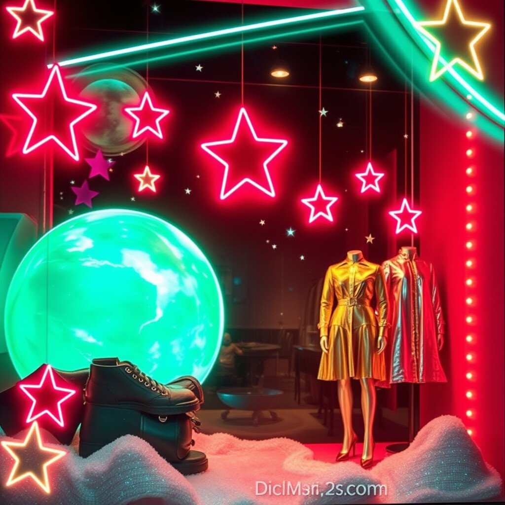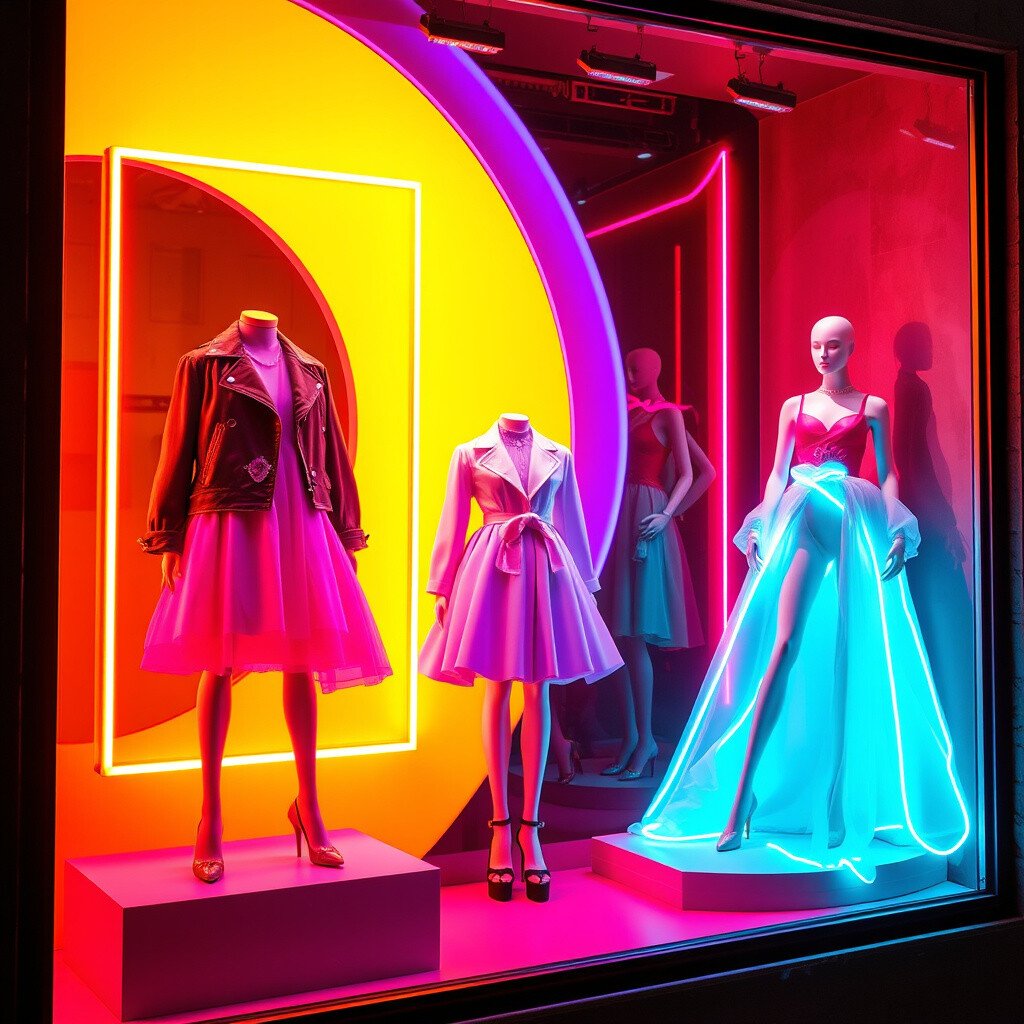 Turn your window into an art gallery with neon frames and sculptures. This idea combines fashion with art, showcasing clothes as works of art.