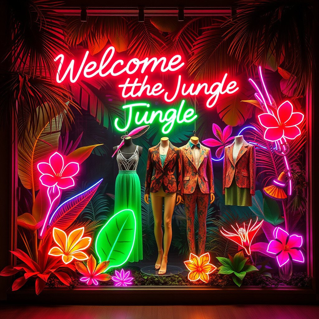 Transform your window into a lush neon jungle. Use neon lights in shapes of palm leaves, exotic flowers, and animals. This creates a tropical paradise that feels both adventurous and relaxing.