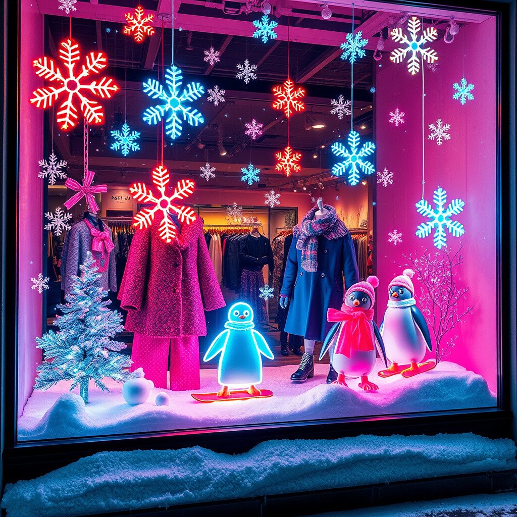 Transform your window into a snowy landscape with neon snowflakes, ice skates, and penguins. This display is perfect for winter collections.