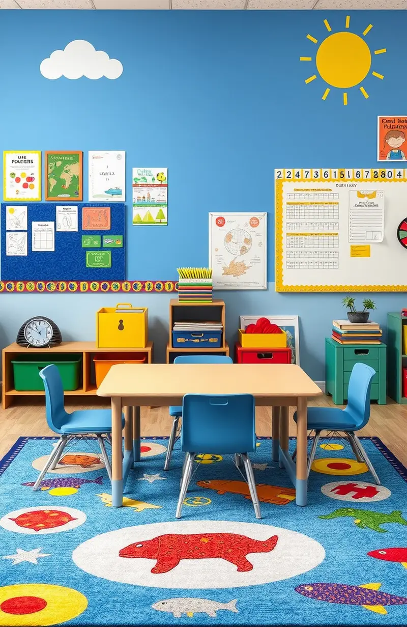 Add a themed rug to the classroom for color and comfort. Choose patterns that fit the classroom theme.