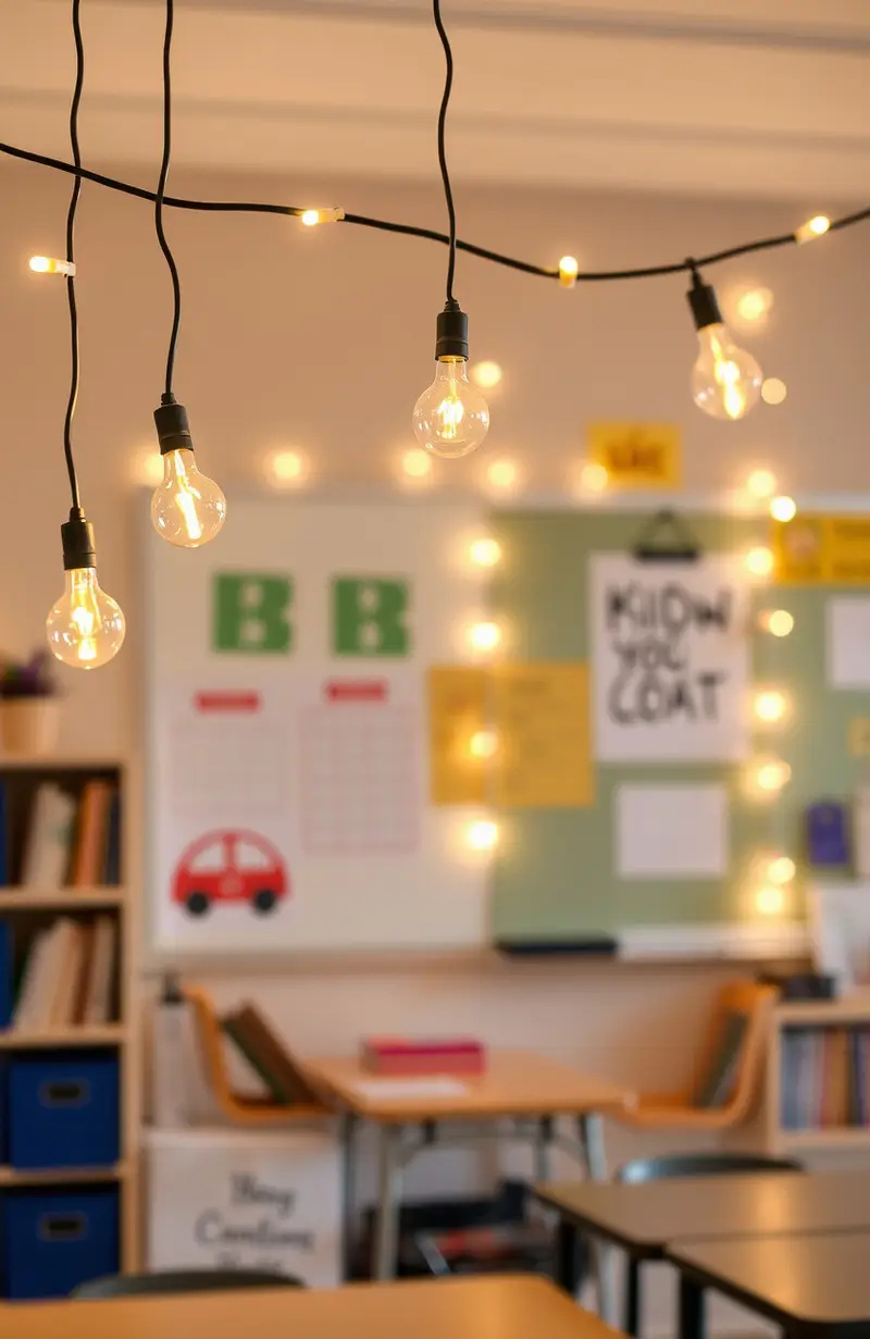 Hang string lights for a cozy and magical effect. They add warmth and charm to any classroom.
