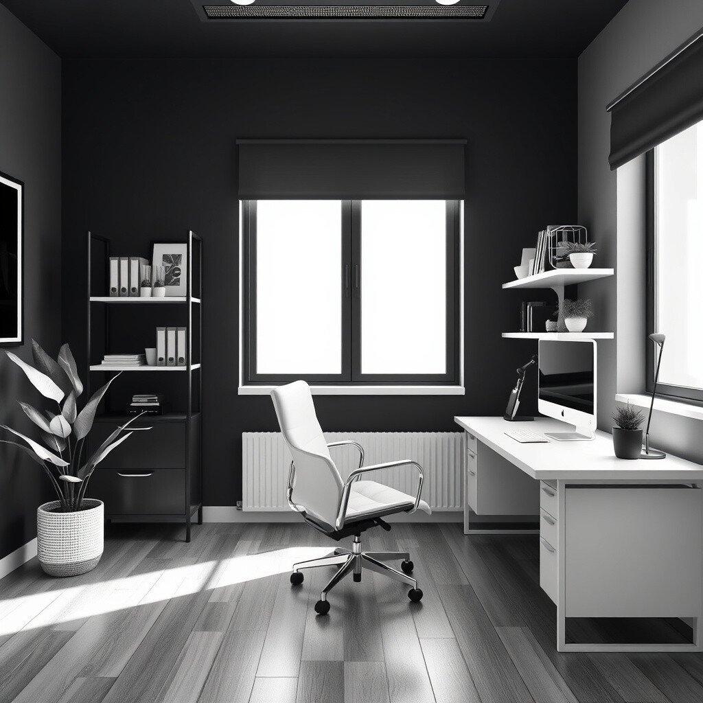 Get sleek and sophisticated with a monochrome office. Black, white, and shades of gray create a timeless aesthetic. It’s like a blank canvas where your ideas can shine.