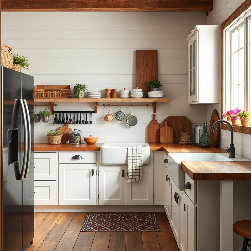 Imagine rustic elements with a modern twist. A farmhouse kitchen combines wood, metal, and ceramic for a welcoming feel. Use shiplap walls and a farmhouse sink.