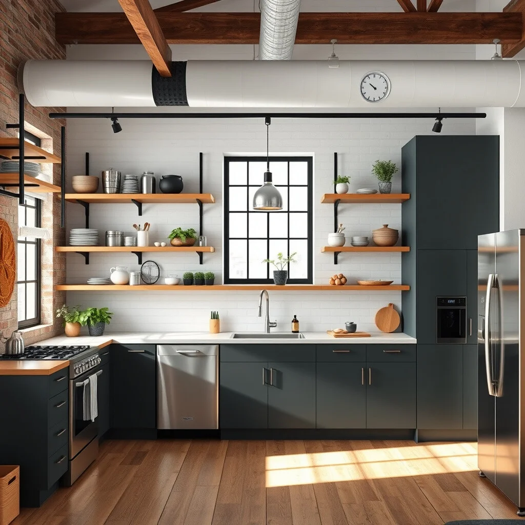 Envision high ceilings and open spaces. An urban loft kitchen blends industrial elements with modern design. Use open shelving and stainless-steel appliances.