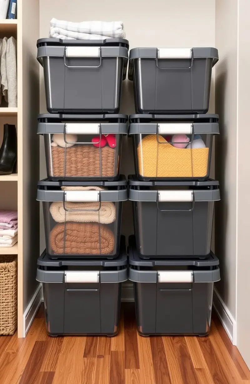 Use stackable bins for a flexible storage solution. They’re great for closets, garages, or playrooms.