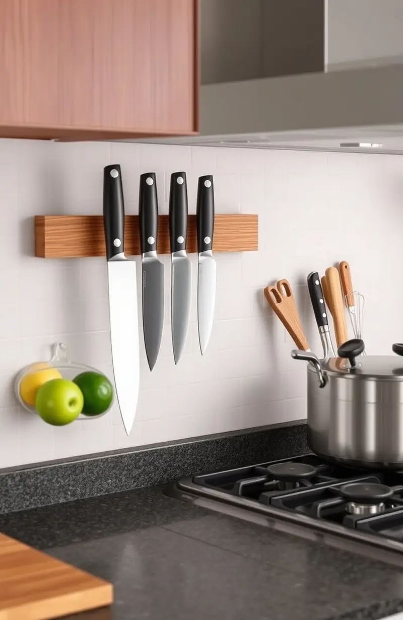 Save counter space by using a magnetic strip to hold knives. It keeps your kitchen organized and your tools sharp.
