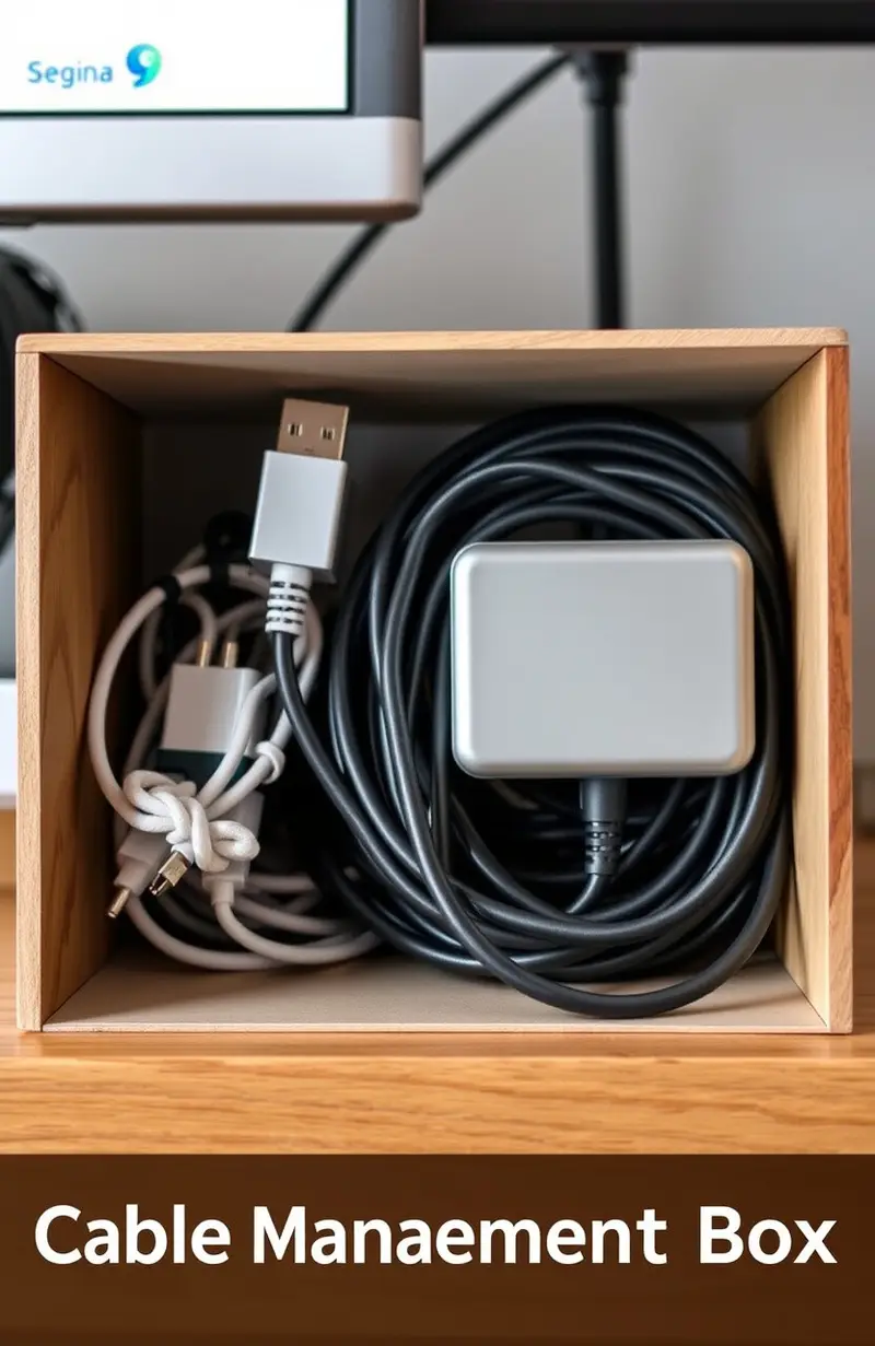 Hide messy cables in a cable management box. It keeps your workspace tidy and your electronics safe.