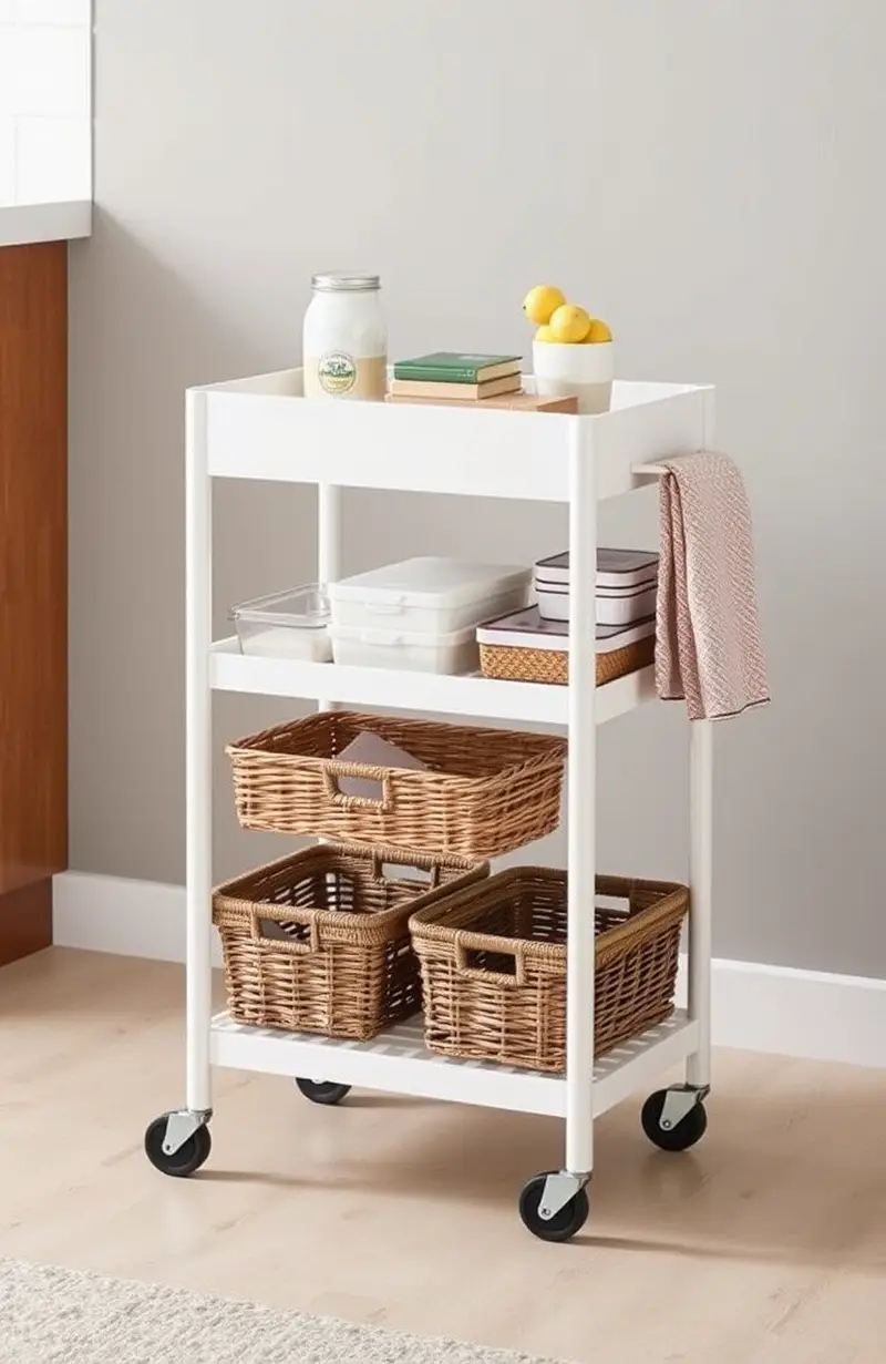 Use a rolling cart for flexible storage. It’s perfect for kitchens, bathrooms, or offices.