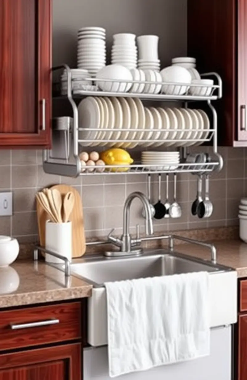 Use an over-the-sink dish rack to save counter space. It keeps dishes organized and your kitchen tidy.