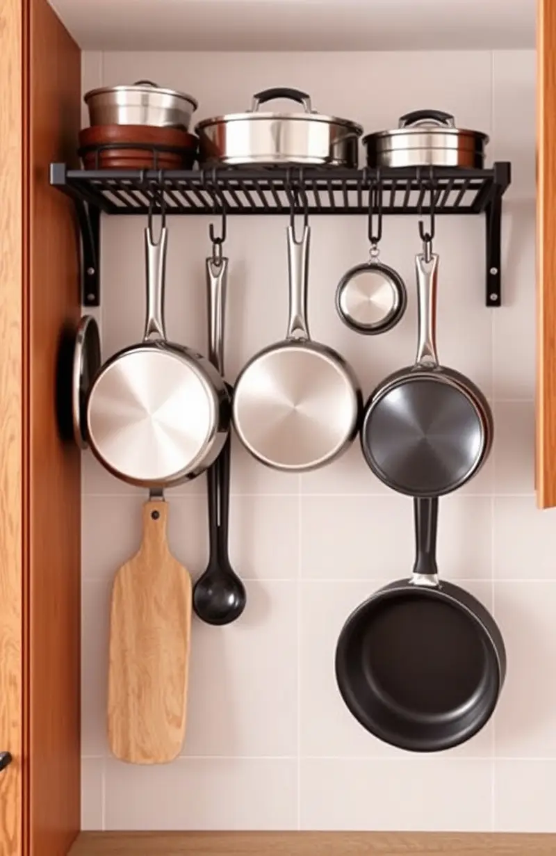 Free up cabinet space with a wall-mounted pot rack. It keeps pots and pans organized and within reach.