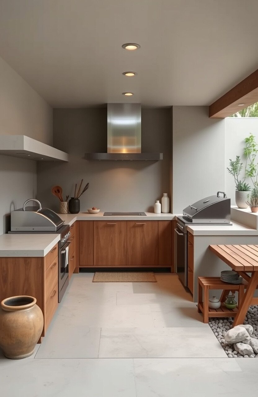Include a small pond or rock garden for added zen. Cooking here is a peaceful retreat.
