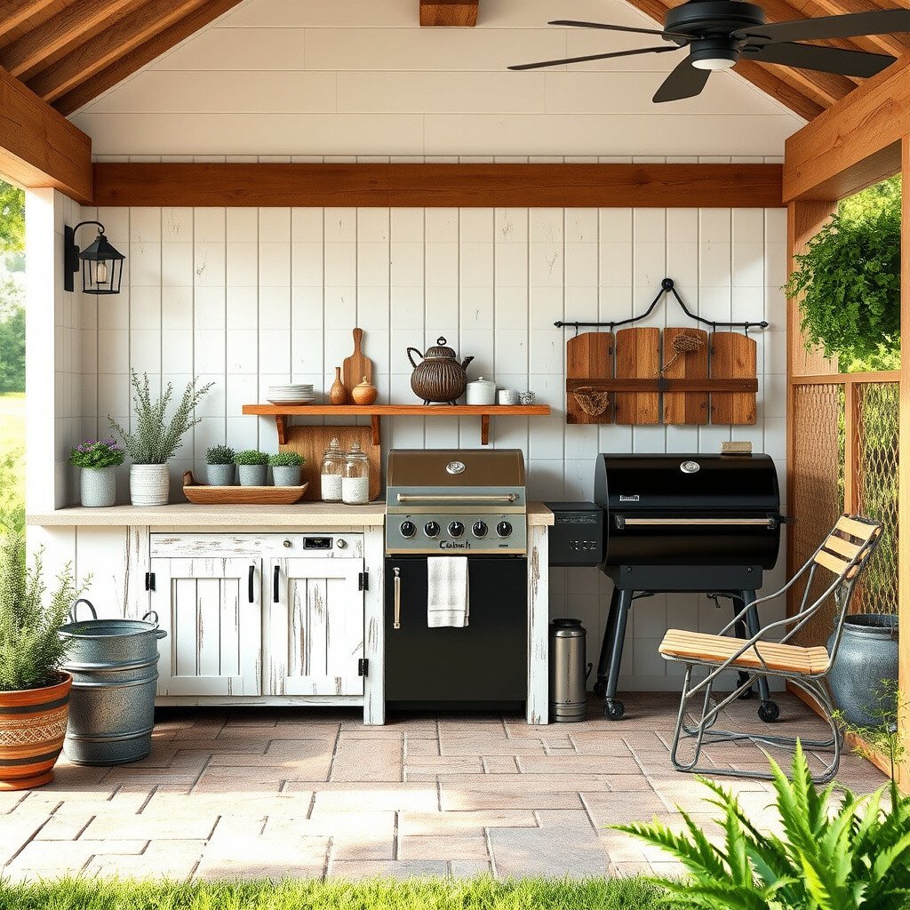 Create a welcoming atmosphere with a farmhouse-style kitchen. Use shiplap, whitewashed wood, and a smoker that fits right into the countryside theme.