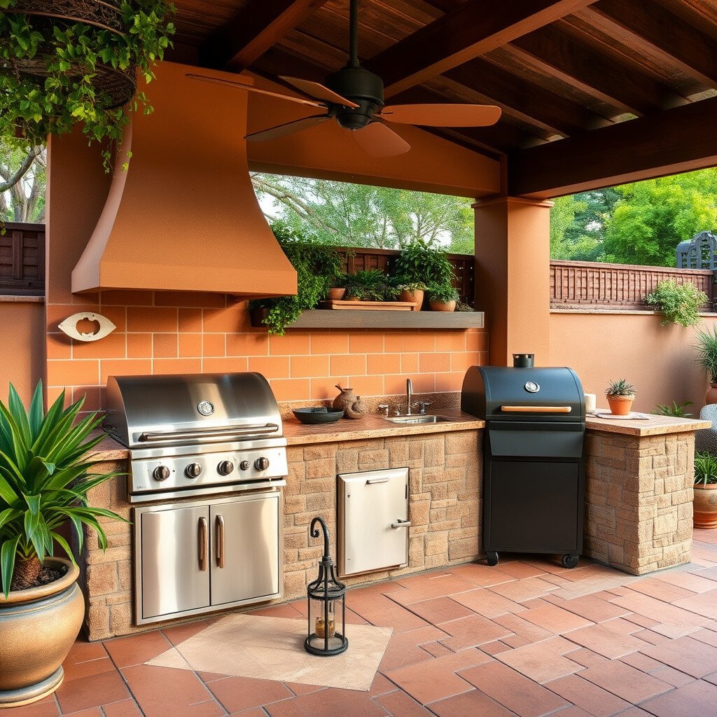 Bring the charm of the Mediterranean to your backyard with warm earth tones and terracotta tiles. A smoker that blends with these elements creates a perfect escape.