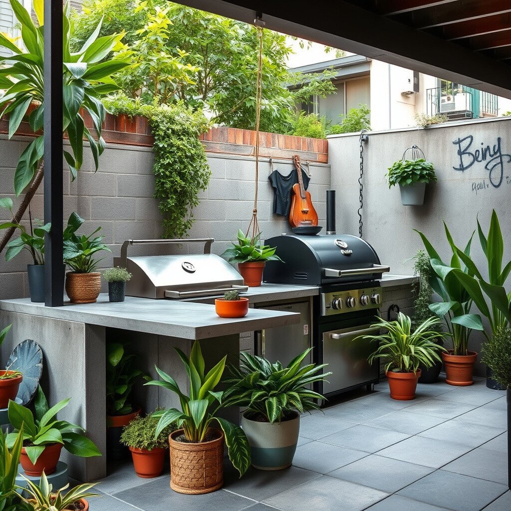 Bring the city to your backyard with an urban jungle kitchen. Think concrete, steel, and an abundance of plants to create a modern oasis.