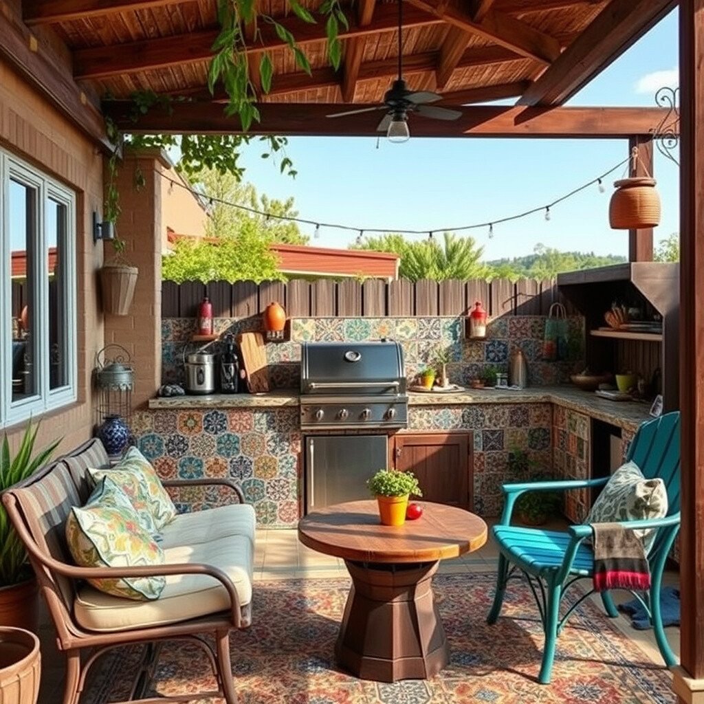 For a laid-back vibe, try a bohemian outdoor kitchen. Think colorful tiles, eclectic furniture, and a smoker that feels like part of an artistic masterpiece. This setup is all about creativity and personal expression.