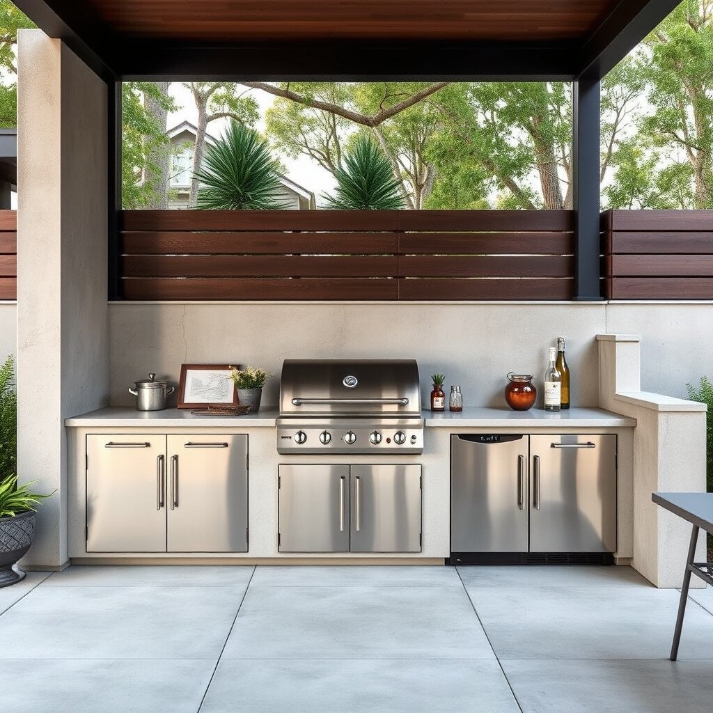 If you love sleek lines and a clutter-free look, a modern minimalist outdoor kitchen is perfect. Use stainless steel and concrete to create a sophisticated platform for your smoker. The clean lines and neutral colors make everything look polished.