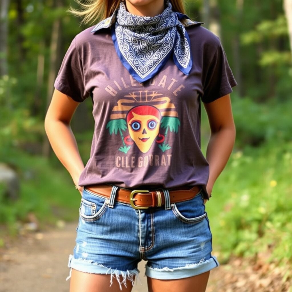 Celebrate nature with a graphic tee and denim shorts. A patterned bandana adds a festive touch.