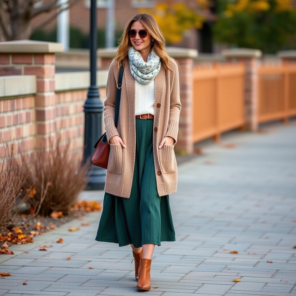 19. Long Cardigan and Midi Skirt A long cardigan paired with a midi skirt creates an elegant and cozy look. This outfit is perfect for a transitional weather day.