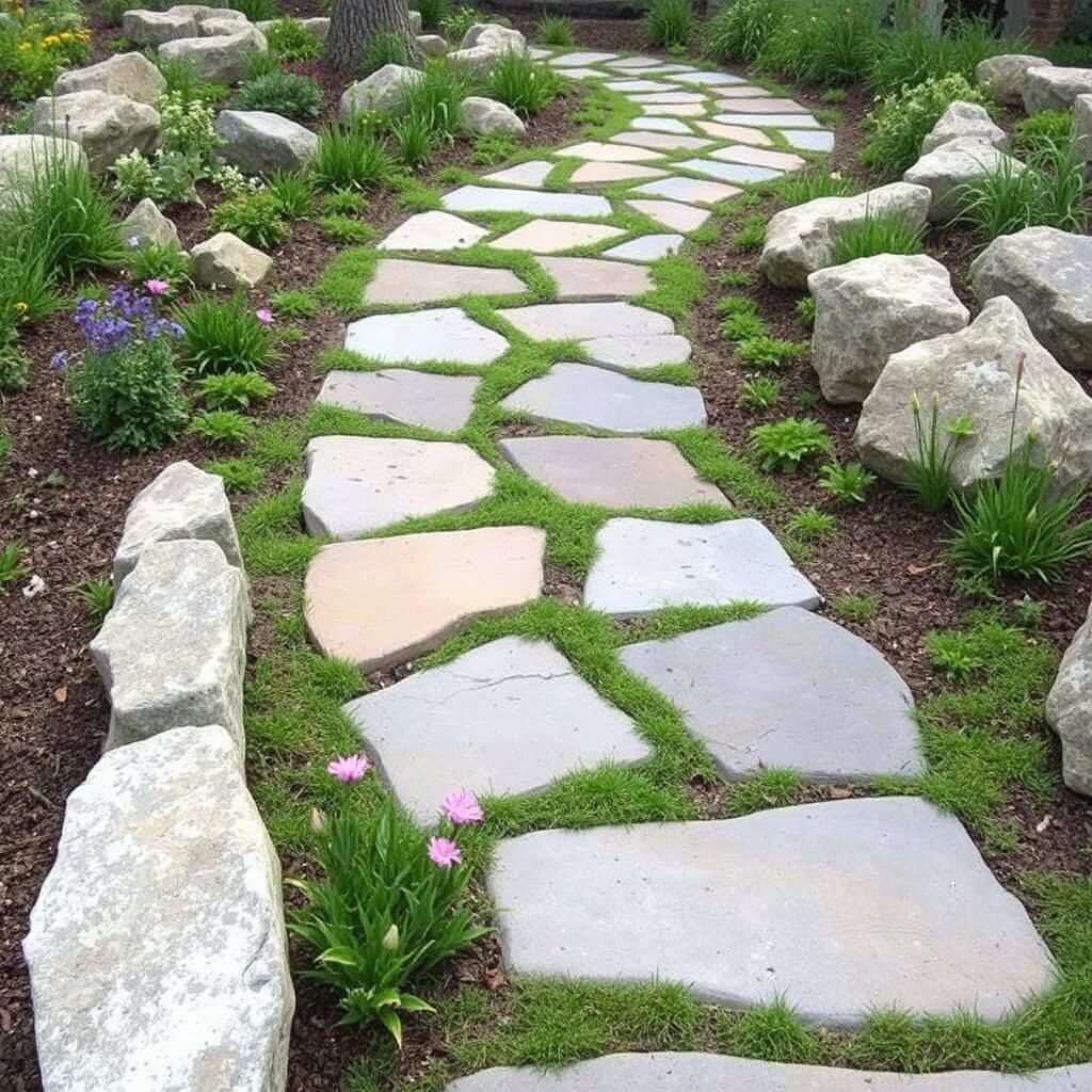 A stone pathway winds through your garden, inviting exploration. Use natural stones for a rustic, organic feel.