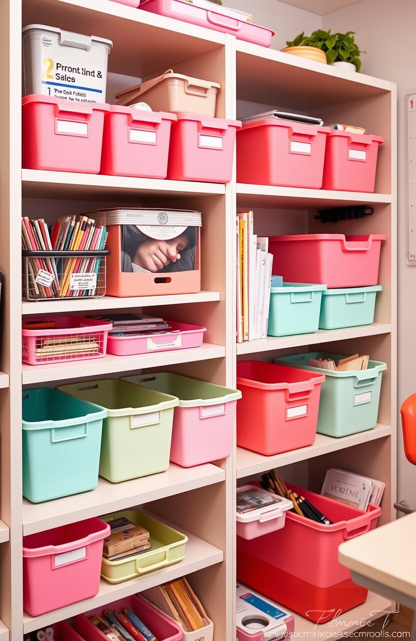 Organize supplies with bins in pastel neon shades. Picture bins in mint or coral neatly lining a shelf, keeping everything in place.