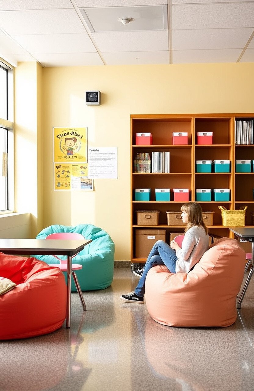 Introduce pastel neon bean bags or chairs for a splash of color. Think of seats in bright coral or mint, inviting students to sit back and relax.