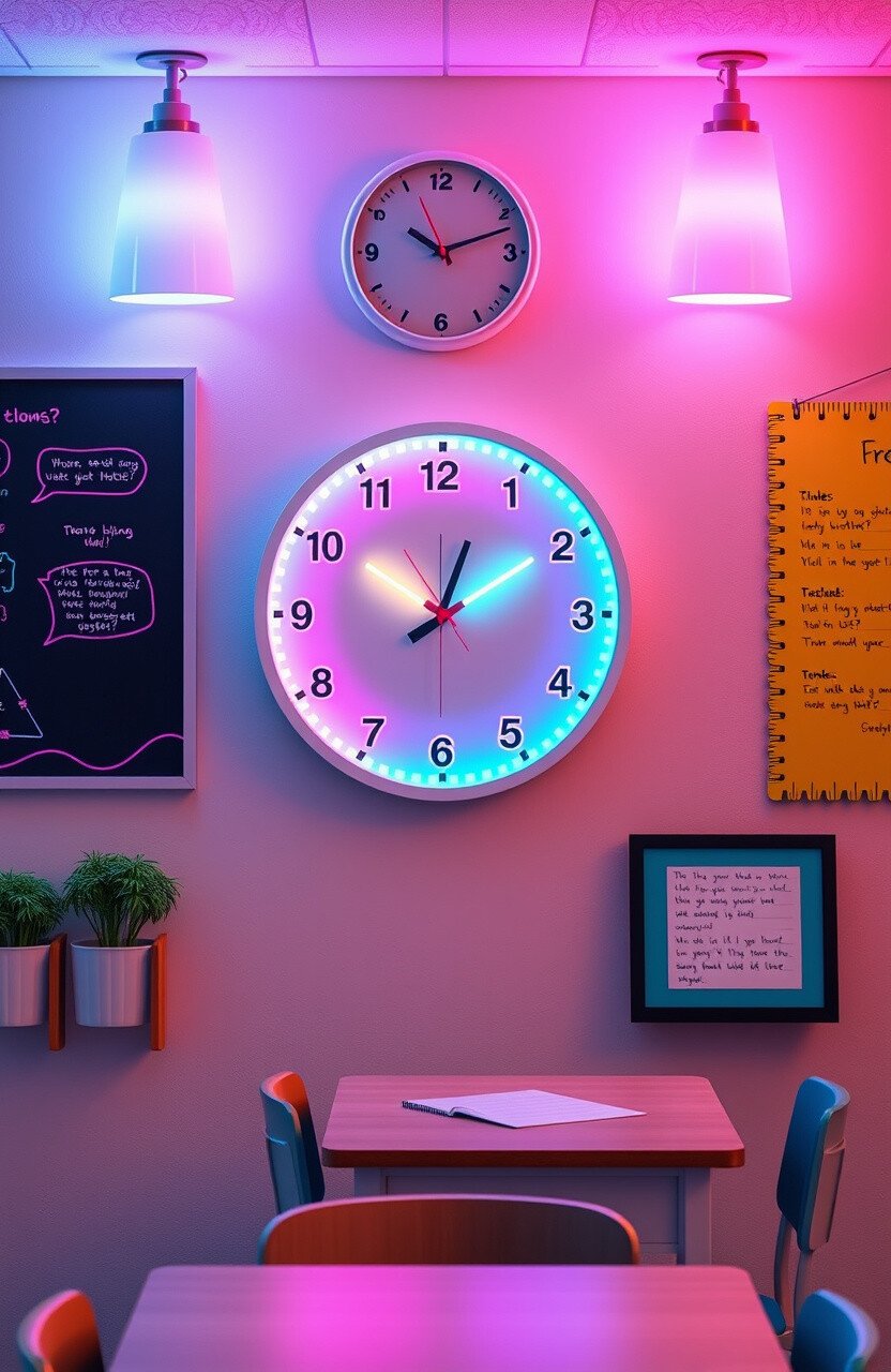 Hang a clock with pastel neon numbers on the wall. This small detail adds a burst of color and keeps everyone on time.