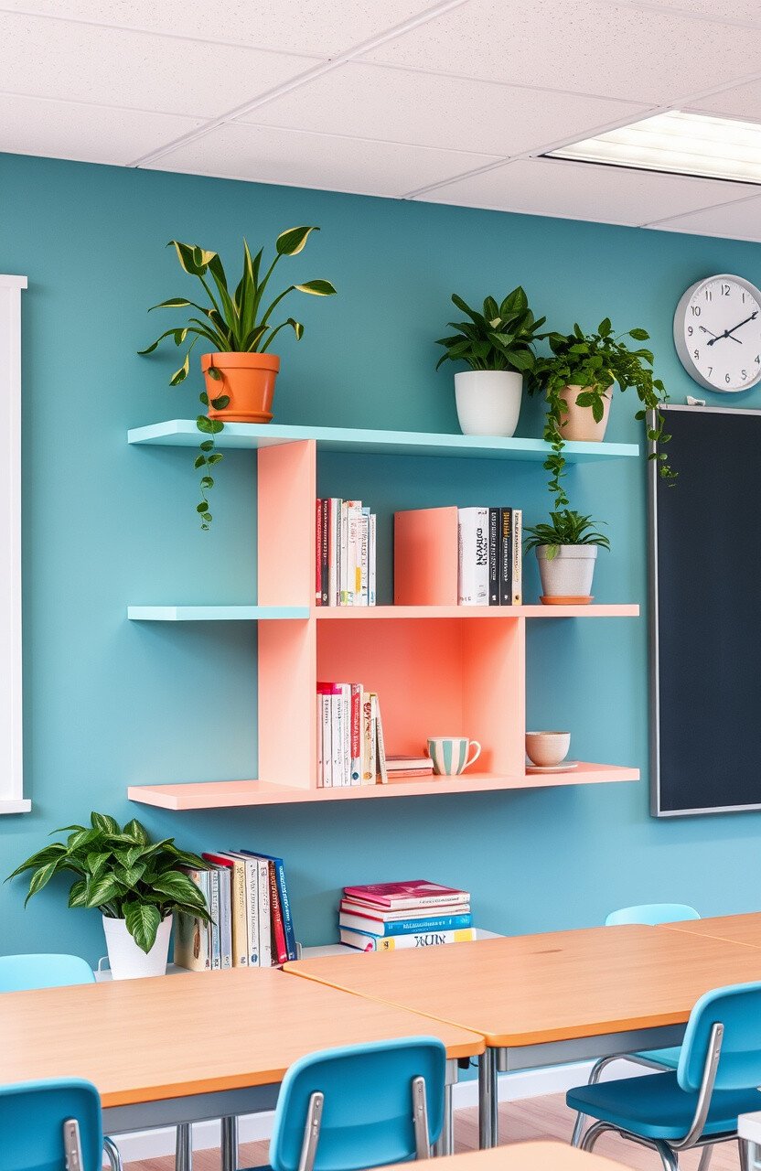 Shelves can be painted or purchased in these trendy colors. They help keep the classroom organized while adding visual interest. This dual-purpose decor is both functional and fashionable.