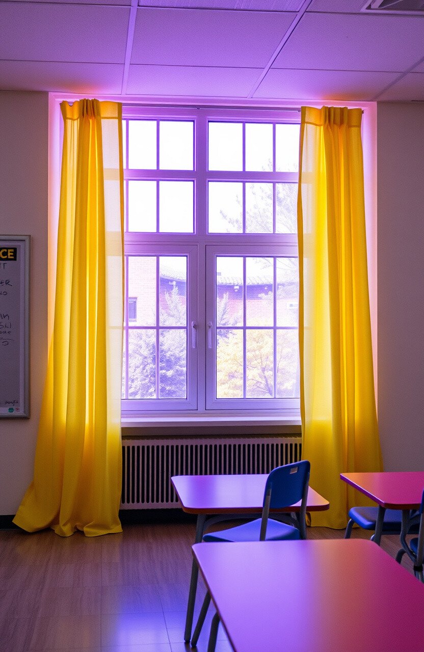 Dress windows with pastel neon curtains in shades like lemon and lavender. These curtains can filter light beautifully, casting a soft glow in the classroom.