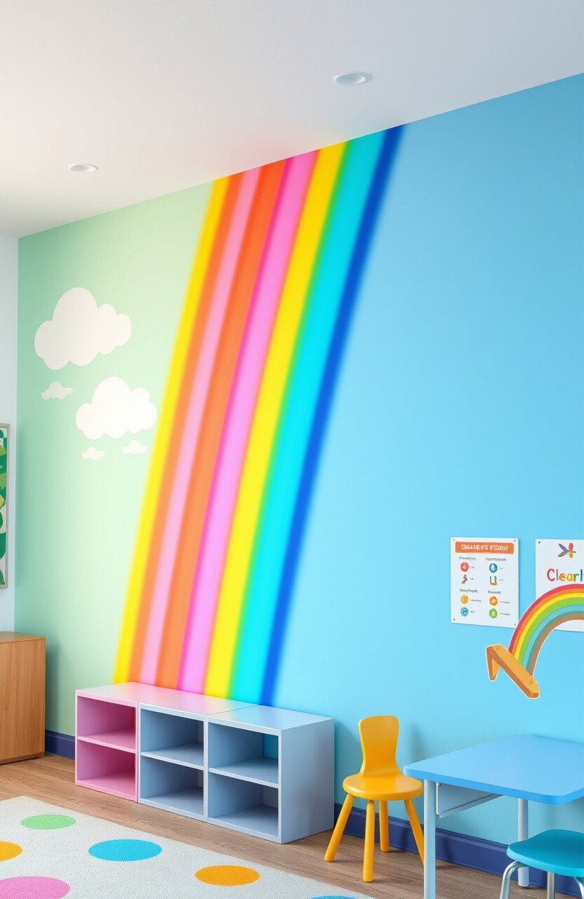 Picture a giant rainbow stretching across the classroom wall. It’s like a window to a magical world! These murals create a joyful atmosphere and encourage imagination.