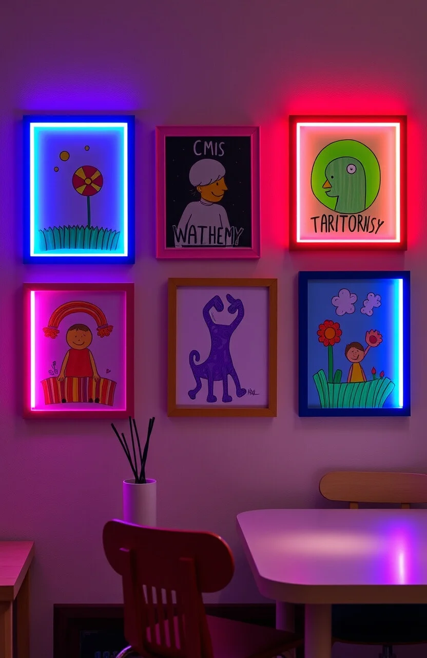 Choose frames with built-in neon lighting or paint existing frames. It’s a unique way to celebrate children’s creativity.