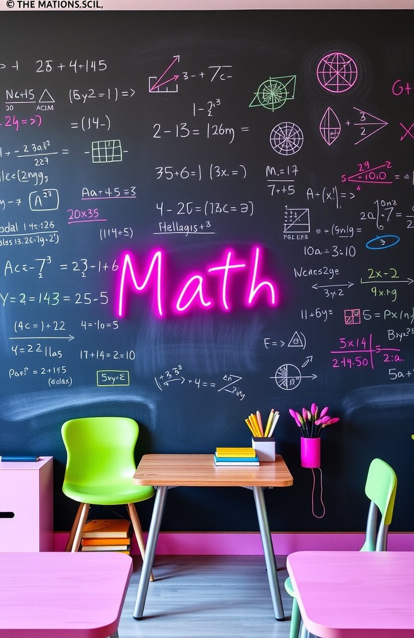 A chalkboard wall in pastel neon colors can be a centerpiece. It’s a space where students can solve problems, doodle, or leave inspiring math quotes.