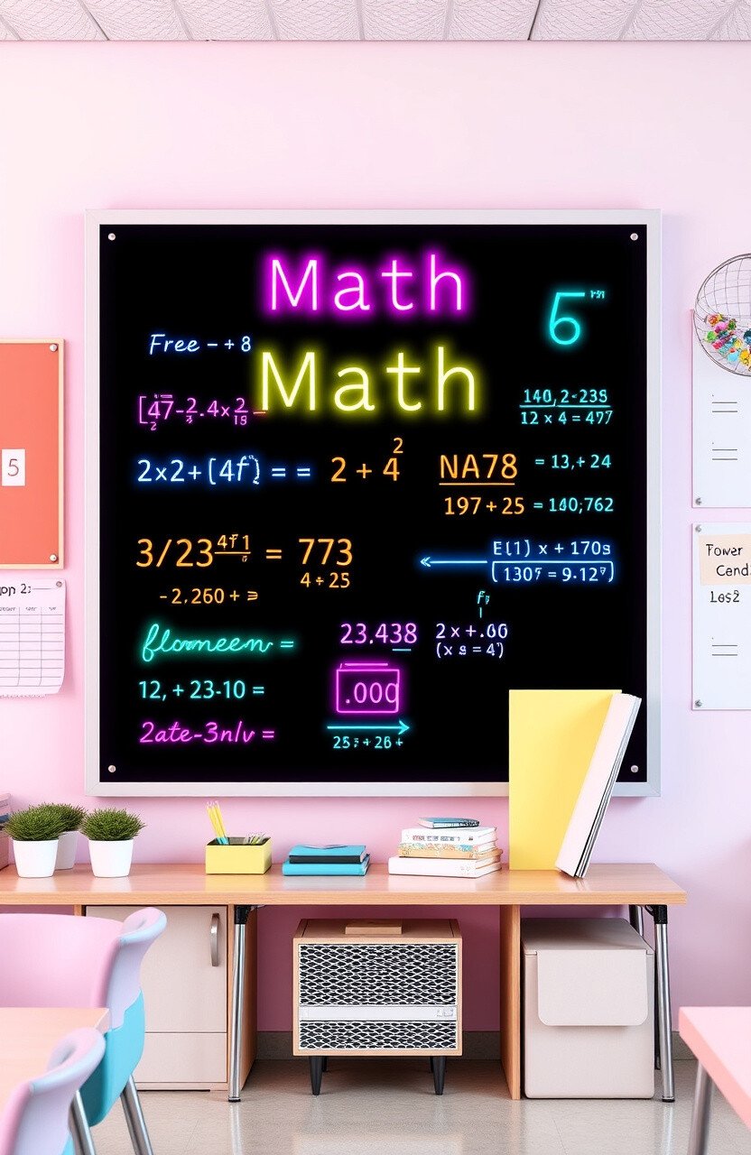 Create or purchase posters with math formulas, operations, and motivational quotes in pastel neon palettes. They are educational and decorative!