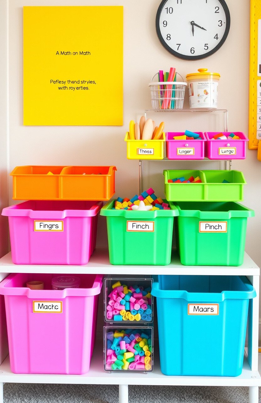 Create a station with bins and trays in vibrant pastel neon colors to store math manipulatives. It’s an organized way to keep tools handy for hands-on learning.