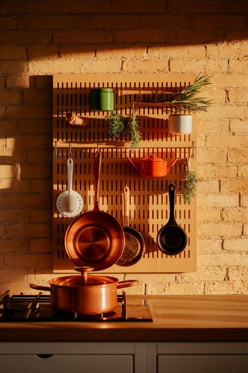 Transform your kitchen into a chef’s paradise with a pegboard that holds utensils, pans, and spices. This arrangement not only boosts efficiency but also adds a rustic charm to your culinary space.
