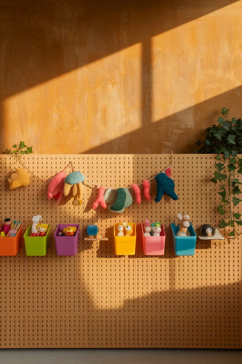 Create a fun and organized play area for your kids with a pegboard that holds toys, books, and art supplies. This setup encourages creativity and keeps the room tidy.