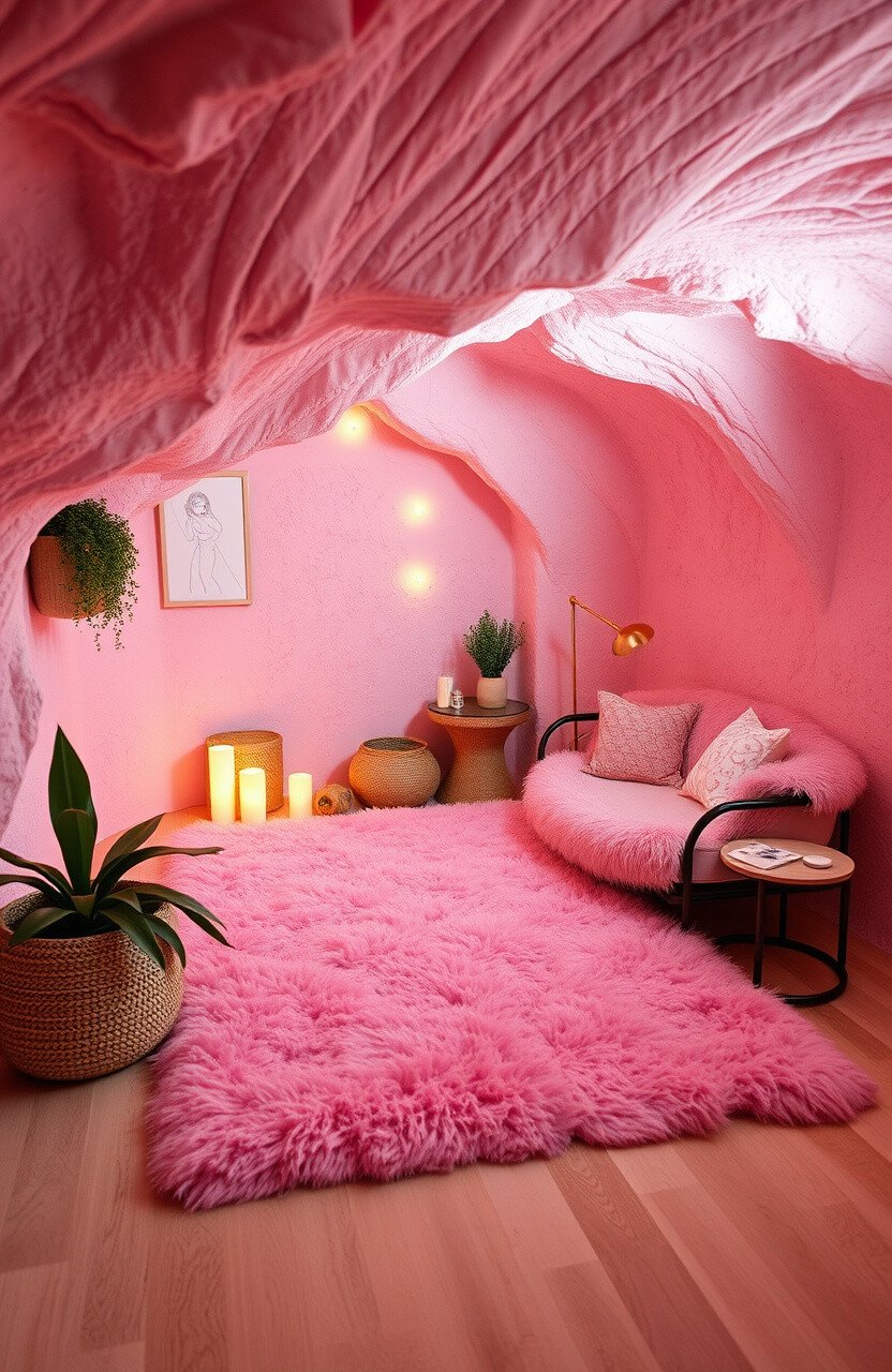 A fuzzy pink rug can transform the floor into a soft, inviting surface. It’s perfect for walking barefoot or lounging with friends.