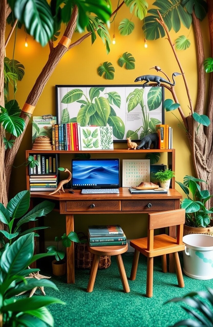 Create a jungle-themed space with models and books. It’s an adventure waiting to unfold in your living room.