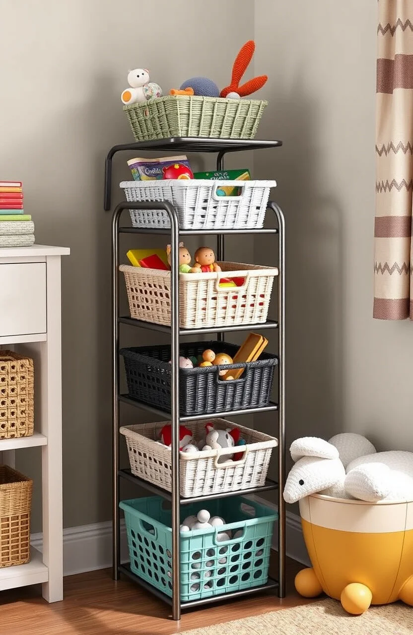 A toy storage basket tower offers a vertical solution for organizing toys. It’s ideal for stacking and saving floor space.