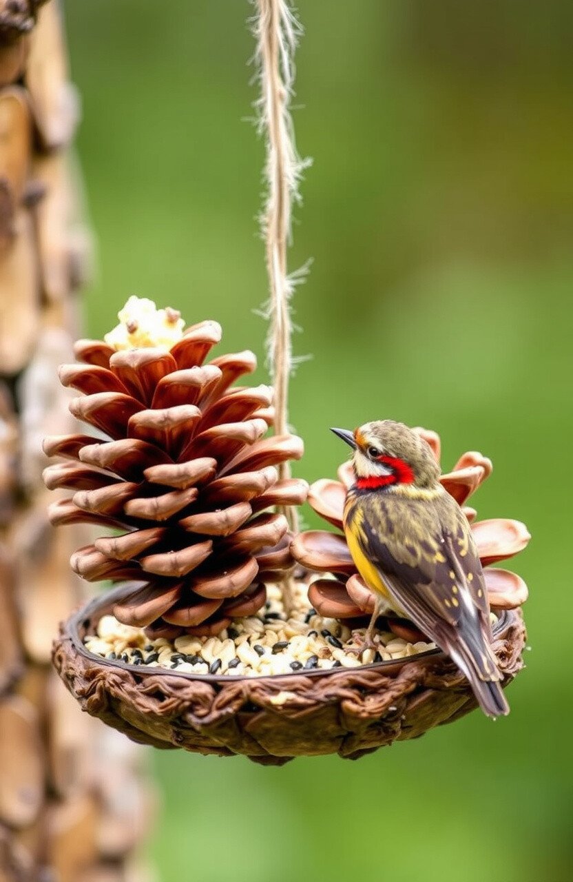 Make a simple bird feeder using pine cones, peanut butter, and birdseed. Hang it outside and watch the birds come!