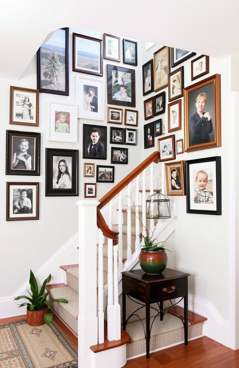 Mix different frame styles and sizes for an eclectic look. It adds depth and interest to your staircase.