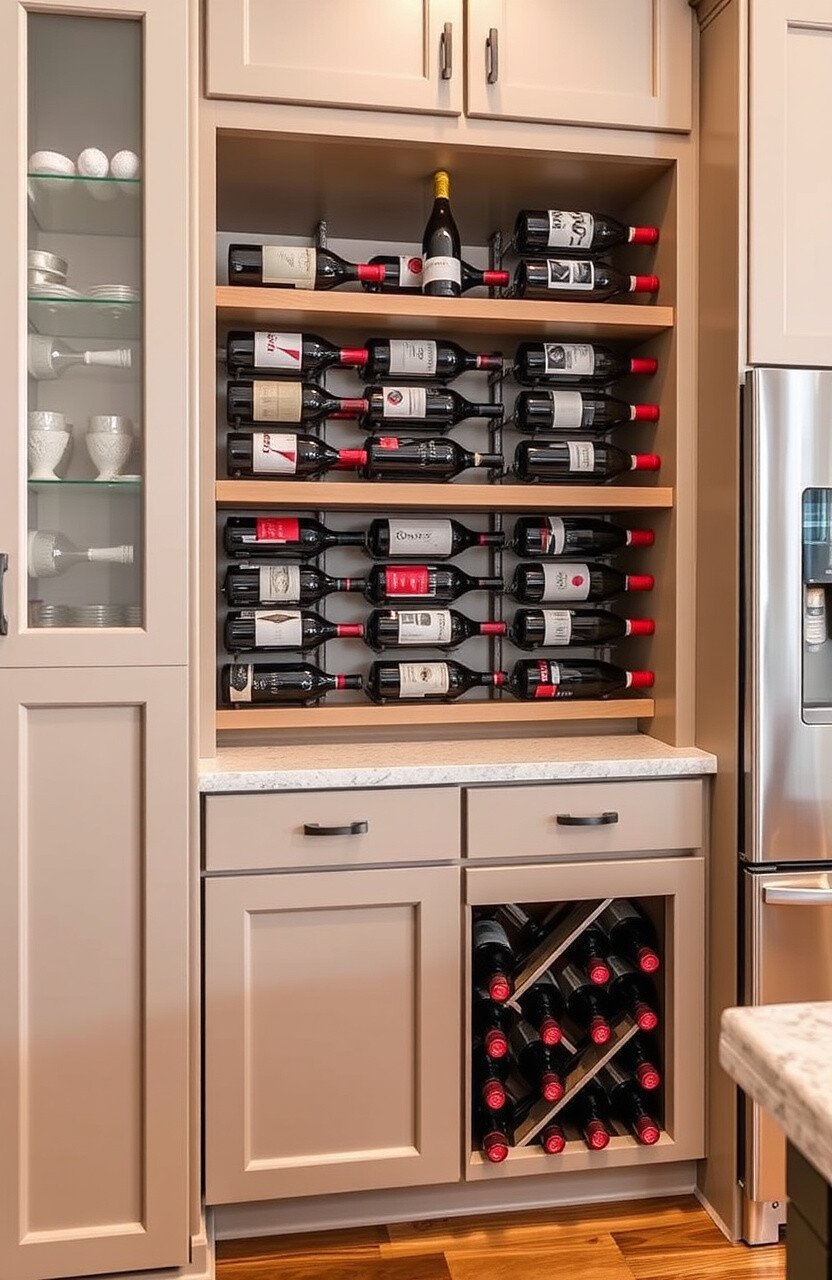 Adding a built-in wine rack to your cabinets can create a stylish storage solution. It’s perfect for wine lovers.
