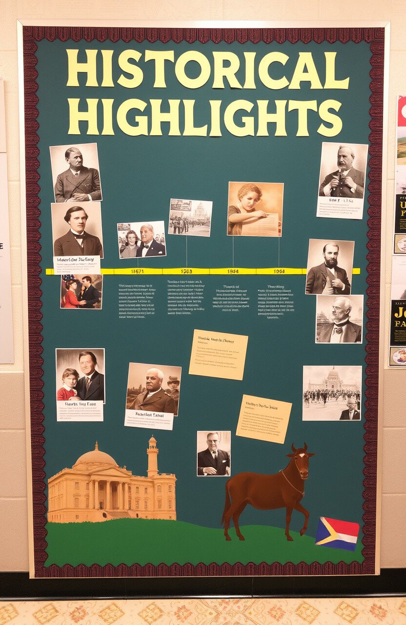 Imagine a bulletin board that highlights key historical events and figures, featuring timelines and stories. It’s a journey through history.