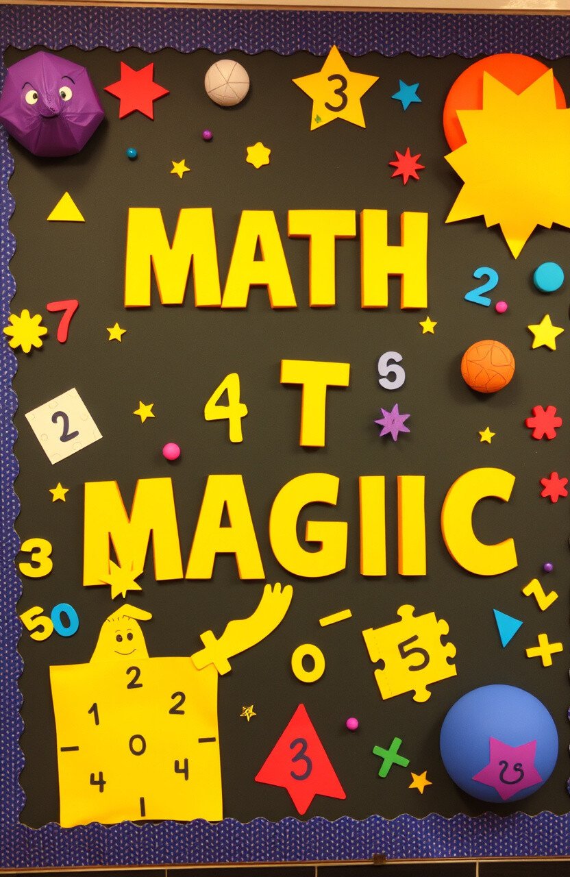 Transform your bulletin board into a world of numbers and shapes, filled with math puzzles and tricks. It’s like a magical math journey.