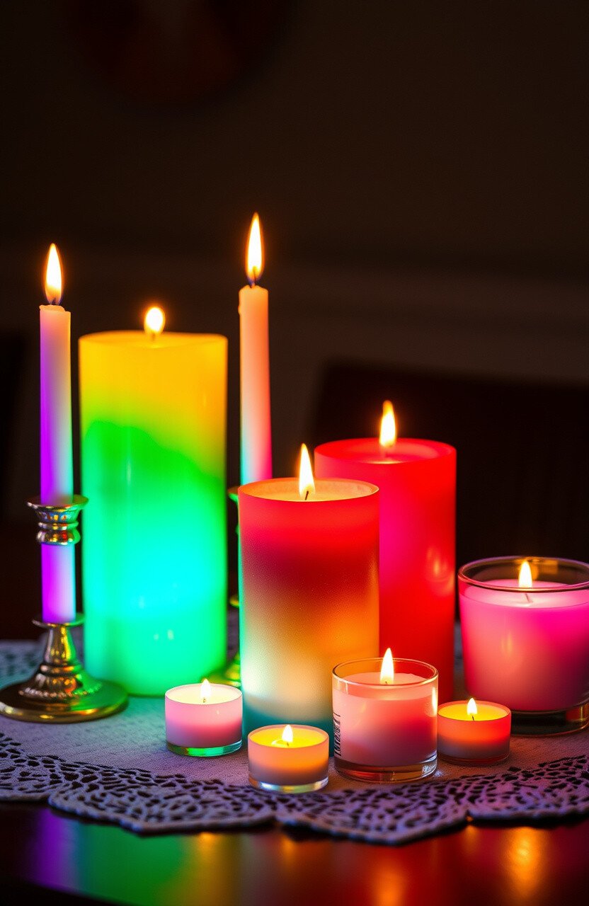 Light up rainbow candles for a cozy, colorful glow. It’s like having a rainbow’s warmth right at home.