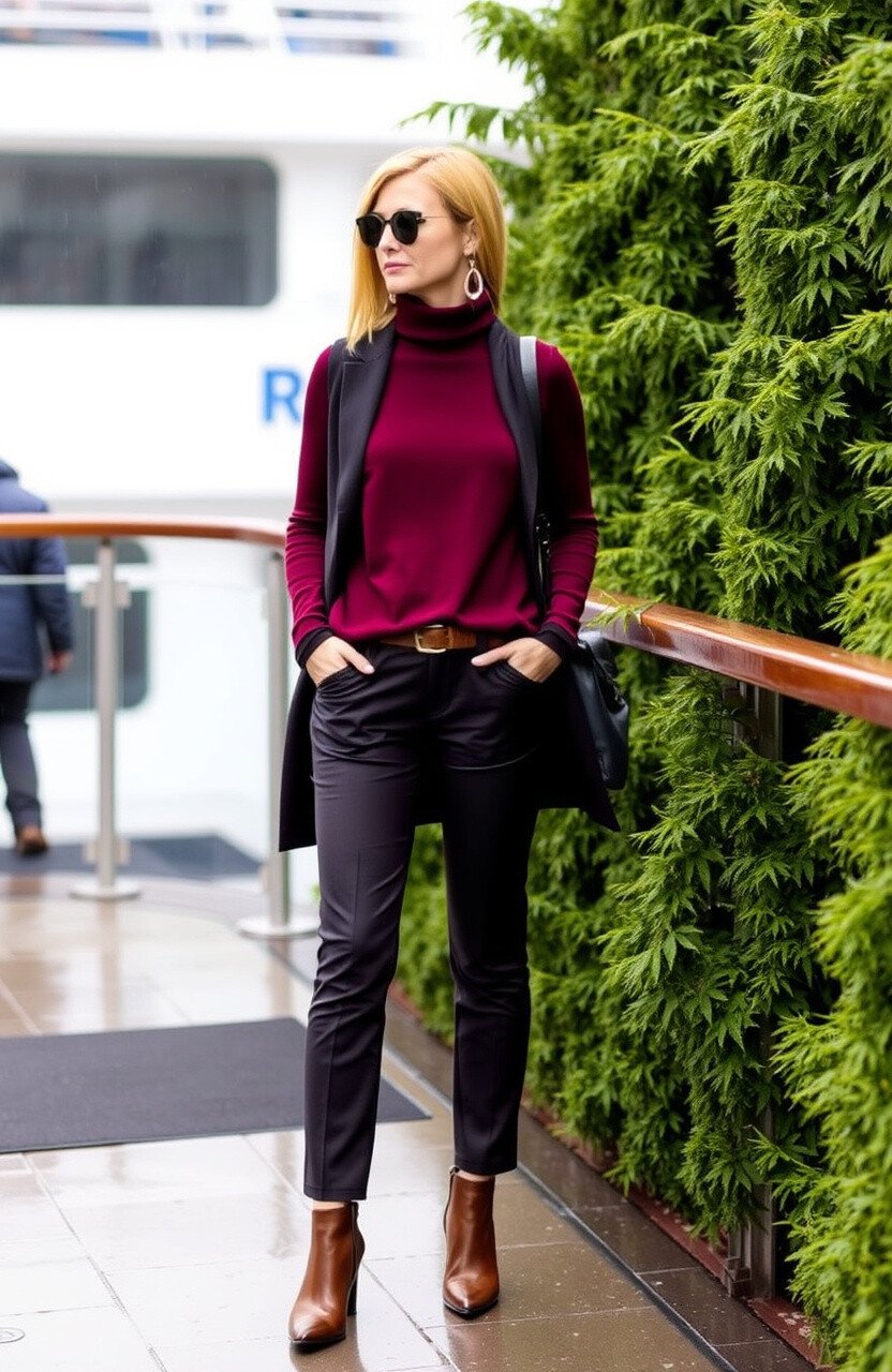 A sleek turtleneck can easily elevate your outfit, giving you a chic silhouette. It’s perfect for a day of exploring Alaska’s breathtaking landscapes while staying snug.